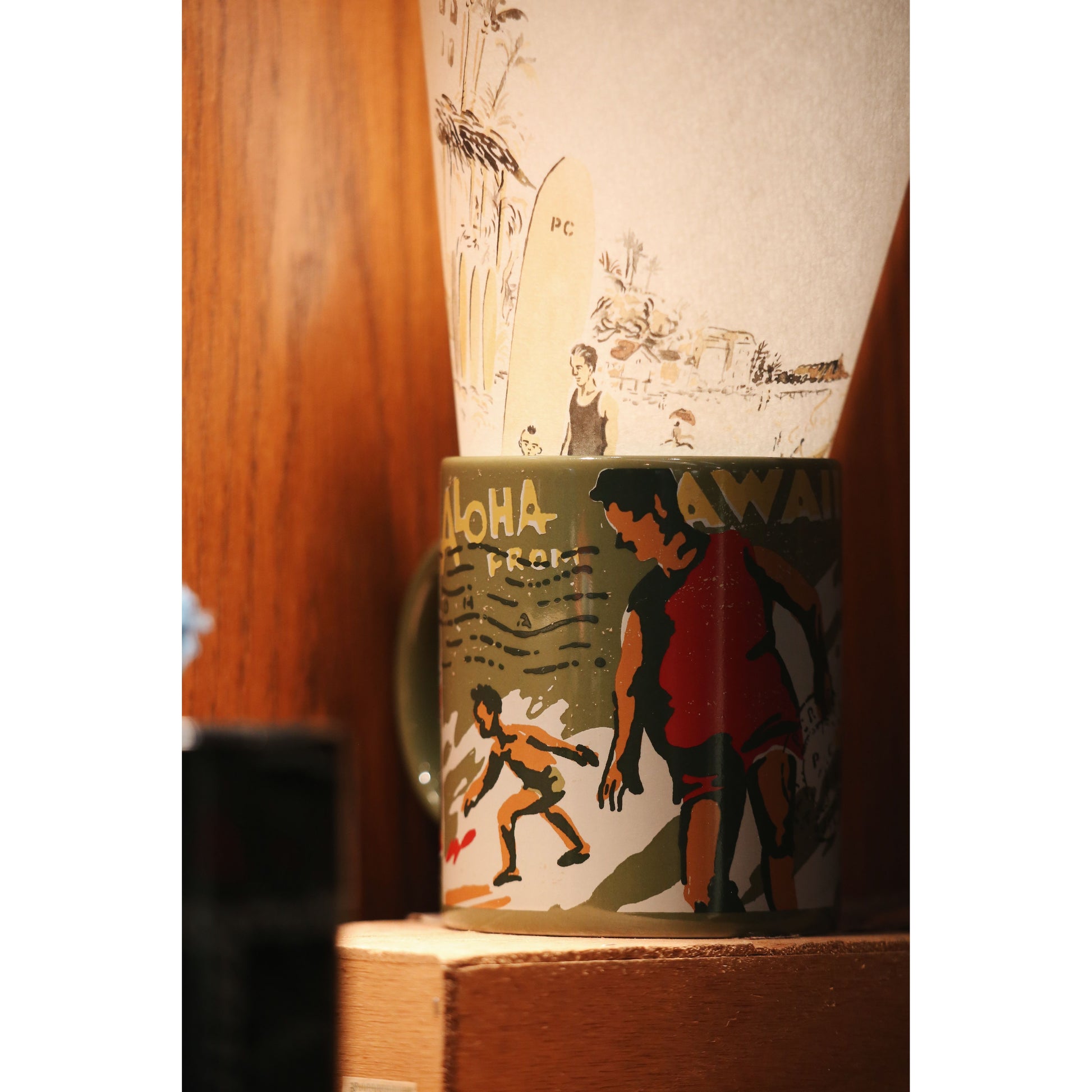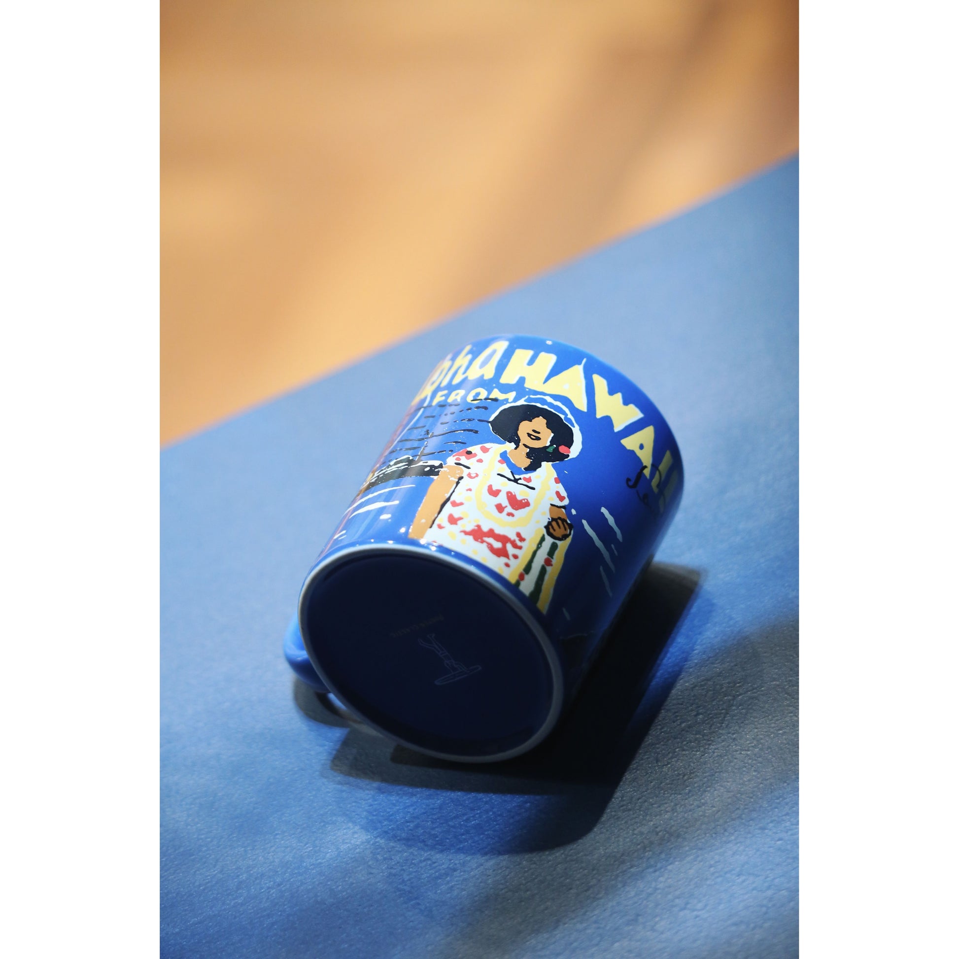 MIMOEさんの素敵な作品をおうちで楽しんでいただけるマグカップ。もちろんメイドインジャパン、美濃焼です。コーヒーでほっと一息はもちろん、文房具やメガネを入れてもお使いいただけます。描かれるのは100年以上前のハワイの切手。古き良き日からのスーベニア。