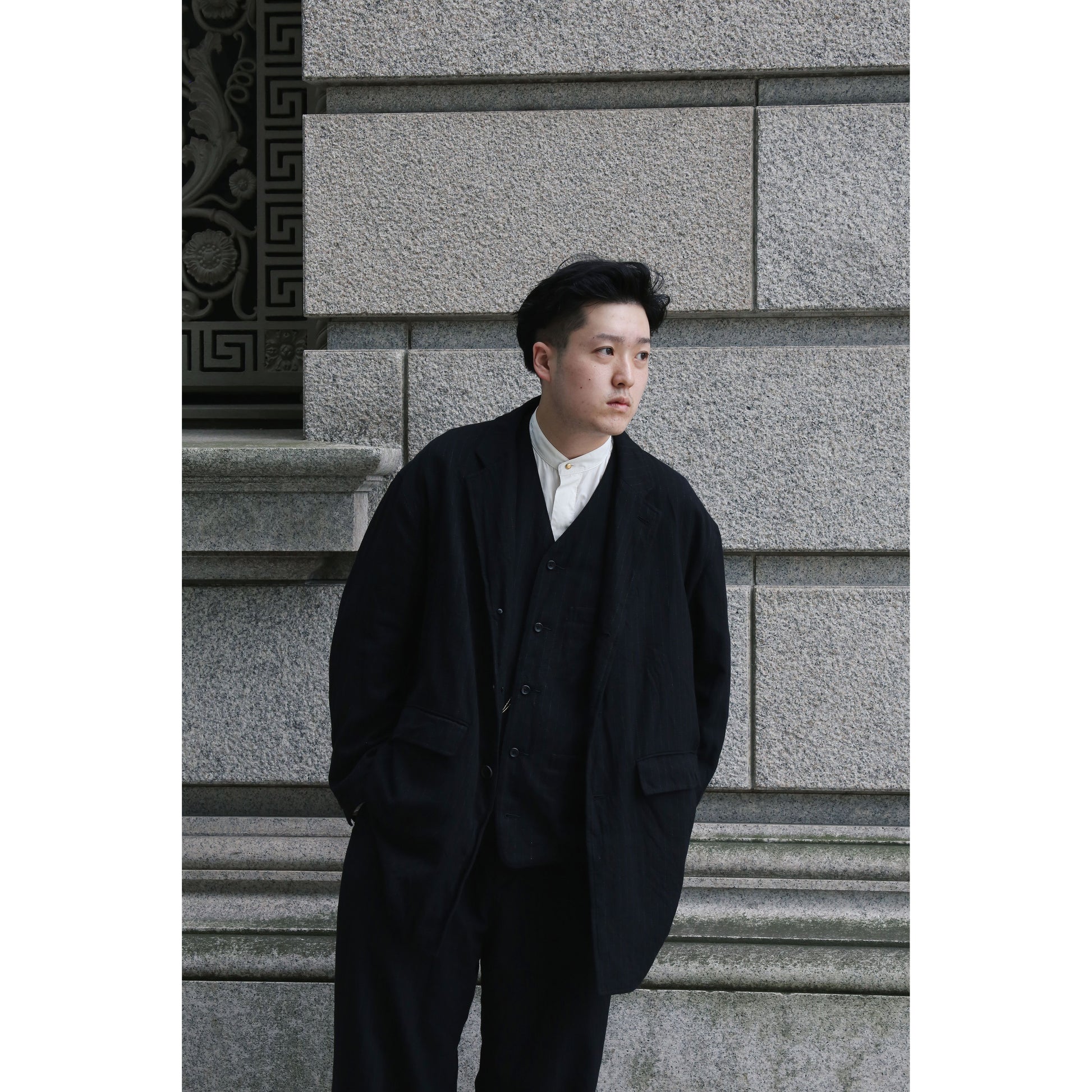 ウールとコットンで織り上げた風合い豊かな生地は、掠れたピンストライプが良い雰囲気です。クラシカルな着こなしに欠かせないベスト。